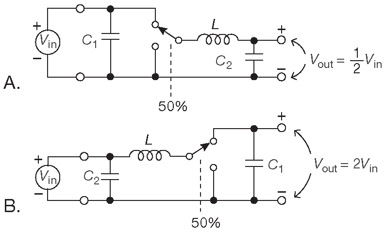 Чтобы оценить, на что способны катушки индуктивности, взгляните на рис. 1.52 . Эти схемы подробно описываются в Части _9 , но, что в них происходит, можно понять с уже имеющимися знаниями. На рис. 1.52A левая половина дросселя \(L\) переключается между напряжением \( V_{in}\) и землёй на какой-то частоте, с равным промежутками временем для каждого состояния ( «50%-скважность» ). Но определение индуктивности \( V=L( dI/dt )\) требует, чтобы среднее напряжение на её выводах было равно нулю, в противном случае ток через катушку рос бы неограниченно. [* Уравнение говорит, что скорость изменения тока равна \( V \) , т.е., если \( V \) не равно нулю, то и скорость изменения тока ненулевая, и ток есть, и меняется] . Данное условие иногда называется правилом баланса произведения вольт-секунда . Из указанного условия следует, что среднее выходное напряжение должно равняться половине входного ( проверьте, что понимаете, почему это так ). В этой схеме \( C_2\) работает накопителем, усредняющим выходное напряжение.