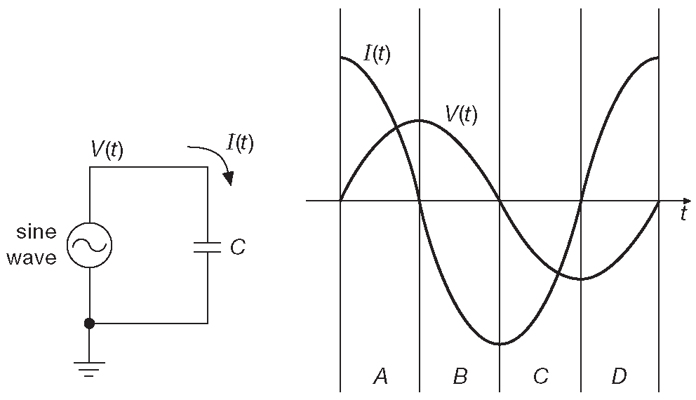 Рис. 1.94 Мощность, подводимая к конденсатору, равна нулю в любой момент времени цикла, благодаря сдвигу фаз между током и напряжением величиной 90°
