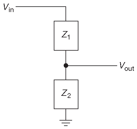 \[ \mathbf{I}=\mathbf{\frac{V_{in}}{Z_{total}}}, \quad \mathbf{Z_{total}}=\mathbf{Z_1+Z_2}, \\ \mathbf{V_{out}}=\mathbf{IZ_2}=\mathbf{V_{in}\frac{Z_2}{Z_1+Z_2}}. \]