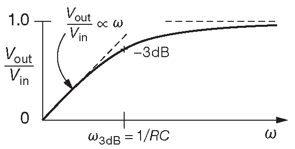 \[ V_{out}=V_{in}\frac{R}{\sqrt{R^2+\cfrac{1}{ω ^2C^2}}}=V_{in}\frac{2 π fRC}{\sqrt{1+( 2 π fRC )^2}}, \qquad [1.35] \] а выглядит, как на рис. 1.99 ( и на рис. 1.91 ).