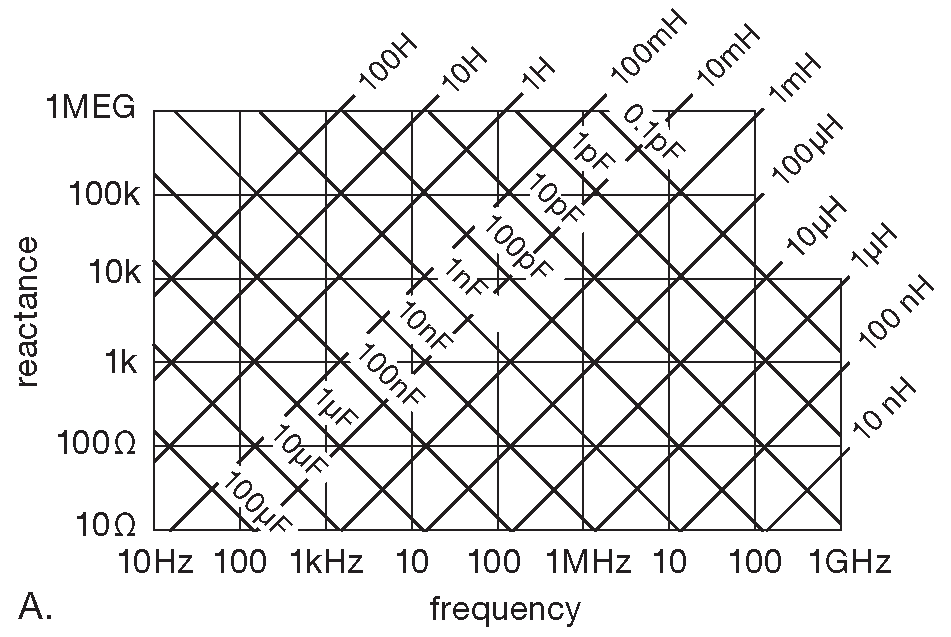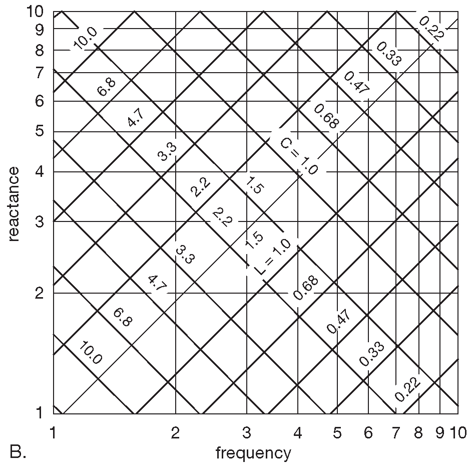 Рис. 1.100 (A) Реактивное сопротивление катушек и конденсаторов в зависимости от частоты. Декады различаются только множителем. (B) Одна декада из графика A в увеличенном виде с номиналами из стандартного 20-процентного ряда ( EIA “E6”). [* См. §С.2 ]