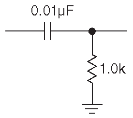 В качестве примера рассмотрим схему на рис. 1.101 . Это фильтр высоких частот с точкой «3dB» 44 на 15.9 kHz . Импеданс на выходе должен быть гораздо выше 1.0 kΩ , чтобы исключить воздействие на параметры схемы, а источник сигнала должен работать на нагрузку 1.0 kΩ без существенной потери амплитуды ( см. разбор граничных условий для работы RC фильтров в §1.7.1.D .