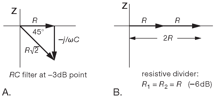 Есть весьма наглядный графический метод, который может быть полезен при изучении реактивных цепей. Разберём, для примера, RC фильтр, ослабляющий сигнал на «3dB» в точке \( f=\frac{1}{2 π RC}\) ( §1.7.8 ). Данное положение верно и для ФНЧ, и для ФВЧ. Здесь легко ошибиться, ожидая, что, раз в данной точке реактивное сопротивление равно сопротивлению резистора, то ослабление составит 6 dB ( т.е. 1/2 ). Это было бы верно, если бы на месте конденсатора был резистор с активным сопротивлением, равным импедансу конденсатора. Ошибка возникает, потому что конденсатор - реактивный элемент, что хорошо видно на векторной диаграмме ( рис. 1.105 ). На одной из осей откладывается действительная ( резистивная ) компонента импеданса, на другой - мнимая ( реактивная ). В последовательных цепях оси отражают также комплексное напряжение, потому что ток во всех точках таких цепей одинаков. В примере ( будем рассматривать его как RC делитель напряжения ) входное напряжение прикладывается к гипотенузе, а выходное снимается с R. Диаграмма соответствует частоте, на которой реактивное сопротивление конденсатора равно по абсолютной величине R, т.е. \( f=\frac{1}{2 π RC}\) . По диаграмме видно, что отношение выходного напряжения ко входному равно 1/\(\sqrt2\) или 3 dB .