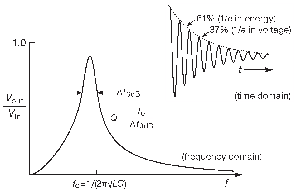 Резонансные LC схемы описываются в терминах реакции по частоте, т.е. в частотной области. Во временнОй обычно рассматривается реакция на импульс или перепад. Для параллельной LC схемы с Q=20 её можно видеть на врезке на рис. 1.107 . Сигнал спадает до 1/e ( 37% ) за Q/π циклов. Накопленная контуром энергия ( пропорциональная \( V^2\)) падает до 1/e ( 61% от исходной амплитуды ) за Q/(2\(π\)) циклов. Возможно, удобнее будет рассматривать процесс в радианах: энергия падает до уровня 1/e за Q радиан, а напряжение за 2Q радиан. Резонансные LC схемы - не единственные, позволяющие провести частотный отбор. Такими же свойствами обладают кварцевые кристаллы, керамические и ПАВ резонаторы, линии передач и объёмные резонаторы [* например, музыкальные инструменты] .