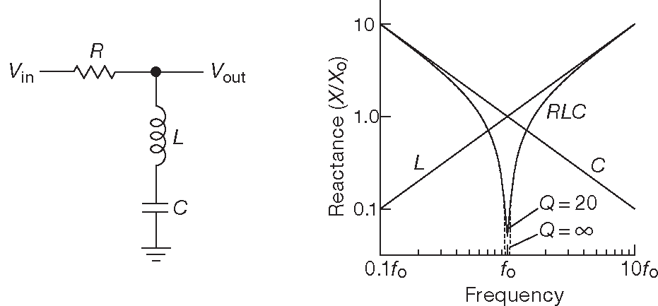 Рис. 1.108 Режекторный LC фильтр. График для реактивных сопротивлений катушки и конденсатора показан справа, но следует учитывать, что их комплексные импедансы имеют противоположные знаки, вызывая резкий спад общего импеданса цепи. Для идеальных компонентов реактивное сопротивление последовательной LC цепи на частоте резонанса равно нулю. Для реальных компонентов до нуля он не доходит и определяется активным сопротивлением катушки