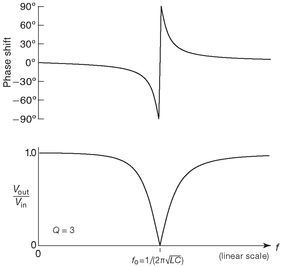 Другой разновидностью резонансных схем является последовательная LC цепь ( рис. 1.108 ). Выписав нужные формулы импедансов и предполагая конденсатор и катушку идеальными компонентами, т.е. отсутствие резистивных потерь 47 , можно обнаружить, что импеданс на резонансной частоте ( \( f_0=\frac{1}{2 π \sqrt{LC}}\) ) становится нулевым. Такая цепь является «ловушкой» для сигналов рядом с частотой резонанса, потому что закорачивает их на землю. Основным местом использования вновь являются радиочастотные схемы. Частотная характеристика показана на рис. 1.109 . Добротность последовательной RLC цепи равна Q=\(ω_0 ( L/R\) ) 48 . Влияние величина Q на форму АЧХ можно посмотреть на рис. 1.110 .
