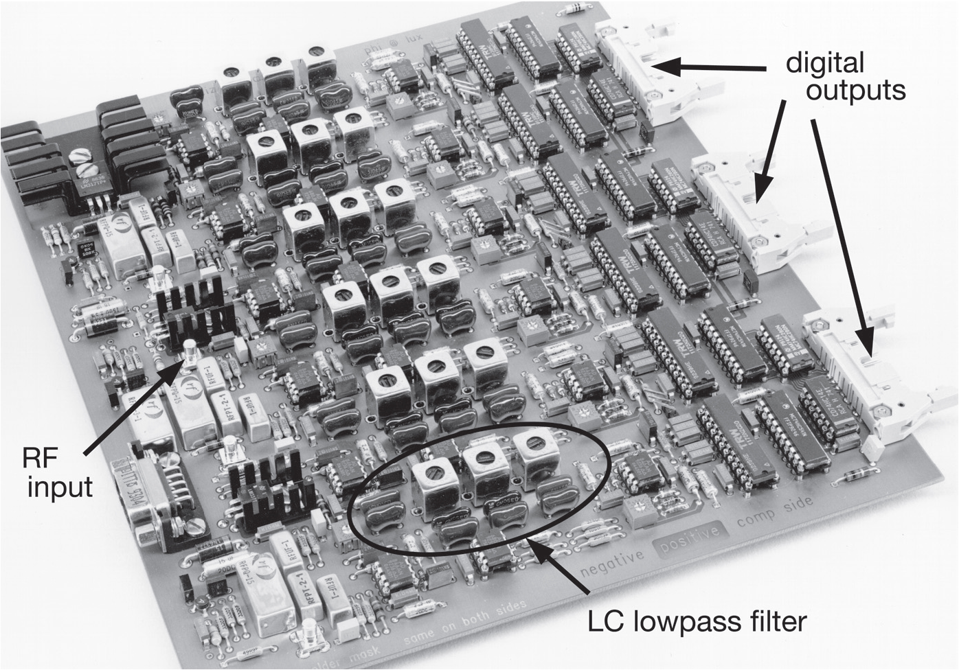 Рис. 1.111 Шесть LC фильтров низких частот на печатной плате - часть схемы преобразования и оцифровки сигнала [* см. рис. 6.8 , 7.29 ]