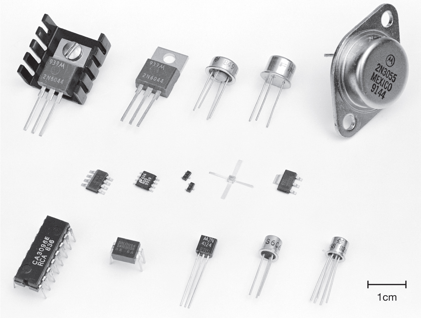 Рис. 2.3 Здесь показана бОльшая часть самых распространённых корпусов. Верхний ряд ( мощные ) слева направо : TO-220 ( с теплоотводом и без него ), TO-39, TO-5, TO-3. Средний ряд ( для поверхностного монтажа ): SM-8 ( сдвоенный ), SO-8 ( сдвоенный ), SOT-23, керамический SOE, SOT-223. Нижний ряд : DIP-16 ( счетверённый ), DIP-4, TO-92, TO-18, TO-18 ( сдвоенный )
