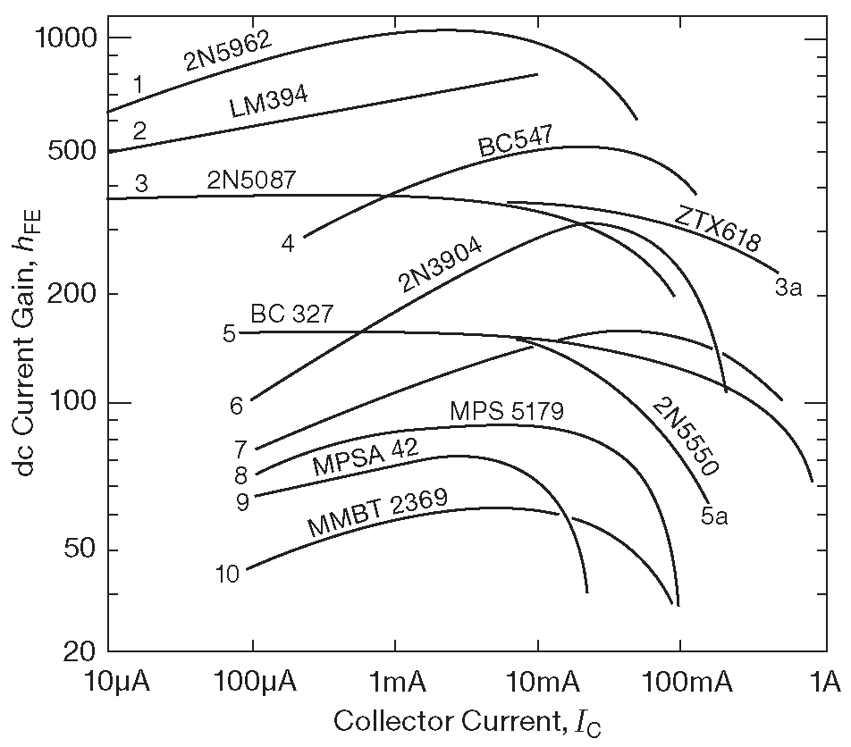 Рис. 2.4 Графики усиления по току для транзисторов из табл. 2.1 . Цифры взяты из справочных данных производителей. Правильно будет закладываться на допуск -50%...+100% от «типичных» значений на графиках. См. также рис. 8.39 , где приведены измеренные значения для 44 типов малошумящих транзисторов