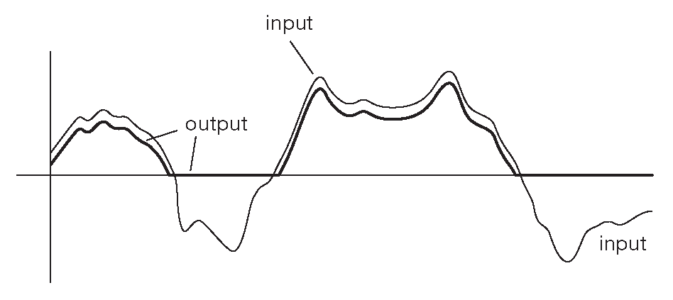 Рис. 2.24 Транзисторный усилитель, питающийся только от положительного источника не способен сопровождать сигнал в отрицательную область
