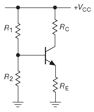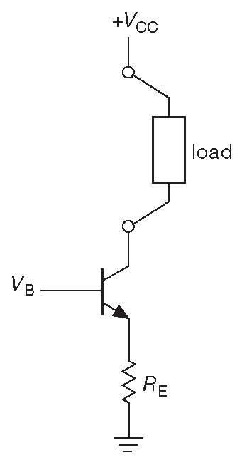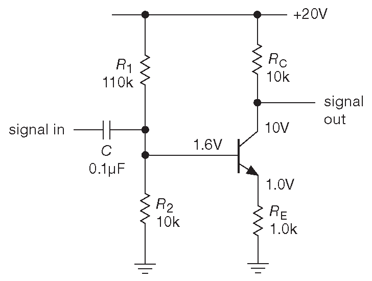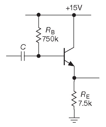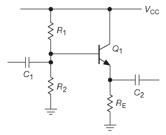 Рис. 2.35 Усилитель сигналов переменного тока с общим эмиттером и эмиттерной дегенерацией. Обратите внимание: выходным терминалом является не эмиттер, а коллектор