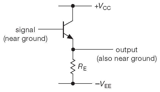 Сигналы часто находятся рядом с уровнем земли, поэтому удобно использовать симметричные положительный и отрицательный уровни питания. Это упрощает смещение и позволяет обойтись без разделительного конденсатора ( рис. 2.26 ).