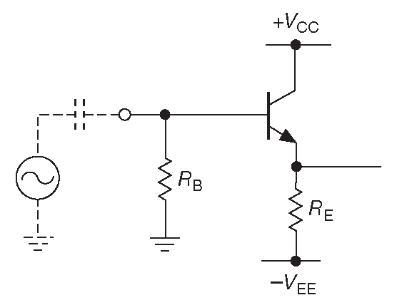 Предупреждение : вы обязаны обеспечивать путь для установившегося ток смещения, даже если он течёт только на землю. В данной схеме предполагается, что путь для тока обеспечивает источник сигнала. Если это не так, например, сигналы связаны через конденсатор, вы обязаны поставить резистор на землю ( рис. 2.27 ) [* см. §4.2.2.A ] . \(R_B\) , как и раньше, должен иметь величину около 1/10 от \(β · R_E\) .