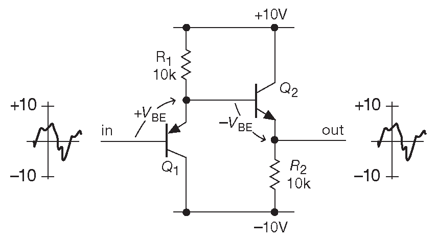 Рис. 2.29 Последовательное включение повторителей на pnp и npn транзисторах позволяет почти полностью скомпенсировать смещение \( V_{BE}\)