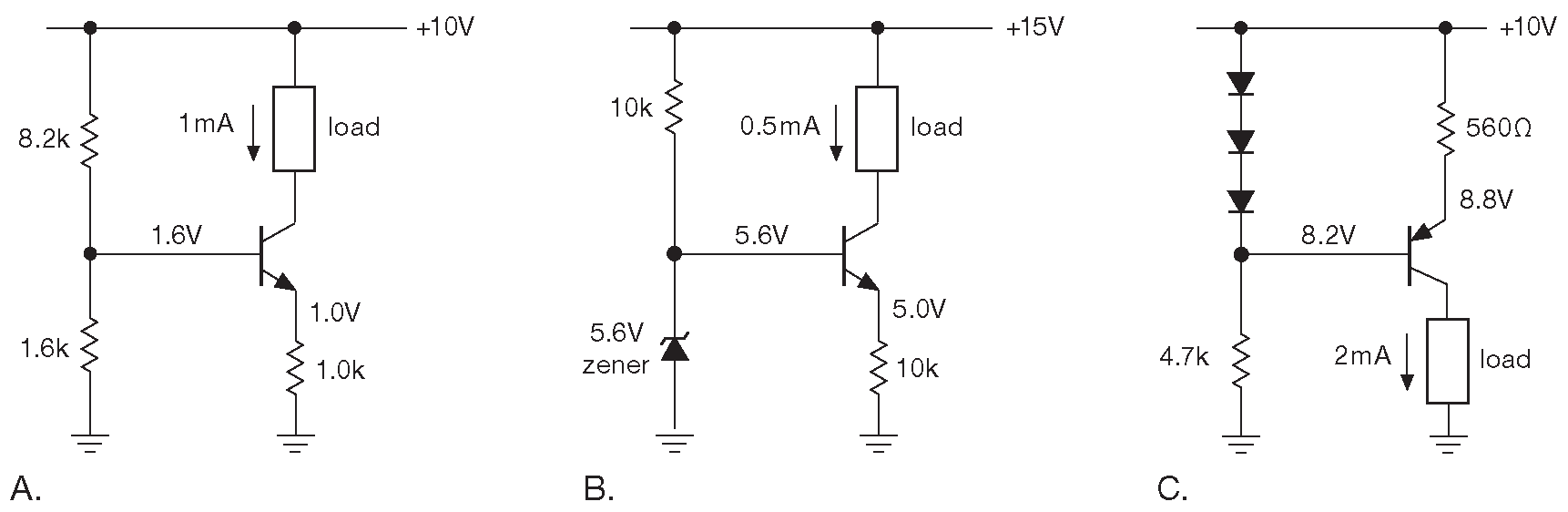 Потенциал на базу можно подать разными способами. Можно делителем, если он достаточно «жёсткий». Как и раньше, критерий выбора: импеданс должен быть сильно меньше, чем импеданс транзистора со стороны базы ( \(β · R_E\) ) . Можно взять стабилитрон ( или аналогичный по действию двухвыводной опорный источник, например, LM385 ), запитав его от \( V_{CC}\) . Или можно подключить между базой и эмиттером несколько последовательных диодов 19 . Некоторые примеры показаны на рис. 2.32 . В последней схеме ( рис. 2.32C ) pnp транзистор является источником тока для заземлённой нагрузки. Два других варианта, использующих npn транзисторы, правильнее называть приёмниками тока, но стандартной практикой является отнесение всех их к «источникам» 20 . На первой схеме импеданс делителя ∼1.3 kΩ и он гораздо меньше, чем импеданс со стороны базы ( ∼100 kΩ для \(β\)=100 ), поэтому изменение усиления мало влияет на потенциал базы и выходной ток. В двух других схемах нагрузочный резистор должен обеспечить несколько миллиампер, переводящих стабилитрон и диоды в проводящее состояние.