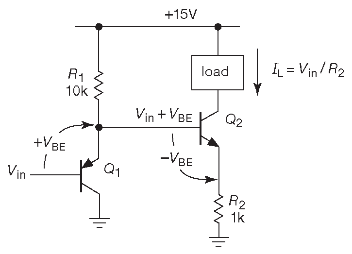 Рассмотрим схему 2.33 . В ней есть стандартный выходной каскад источника тока на \(Q_2\) . Ток устанавливается напряжение на эмиттерном резисторе \(I_L=V_E/R_2\) , поэтому напряжение на базе должно быть на \( V_{BE}\) выше ( необходимое смещение ), но это именно то, что pnp повторитель делает естественным образом. Вуаля! Напряжение на эмиттере \(Q_2\) стало примерно равно \( V_{in}\) , а выходной ток \(I_L=V_{in}/R_E\) без каких-либо оговорок и смещений.