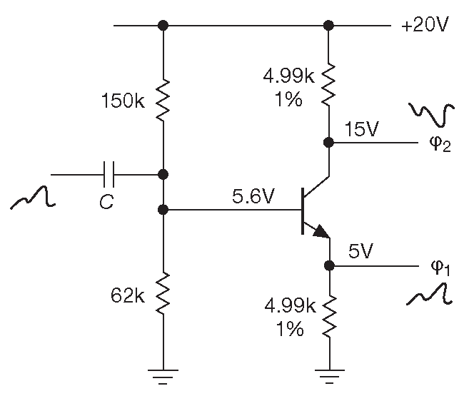 Иногда требуется иметь сигнал и его инверсию, т.е. два сигнала с разницей фаз 180° . Это легко осуществить: достаточно взять усилитель эмиттерной дегенерацией и коэффициентом передачи –1 ( рис. 2.36 ). Напряжение покоя на коллекторе составляет 0.75\( V_{CC}\) , а не обычные 0.5\( V_{CC}\) , чтобы получить максимально симметричные сигналы без ограничения на обоих выходах. Сигнал на коллекторе может меняться от 0.5\( V_{CC}\) до \( V_{CC}\) , а на эмиттере - от 0V до 0.5\( V_{CC}\) .
