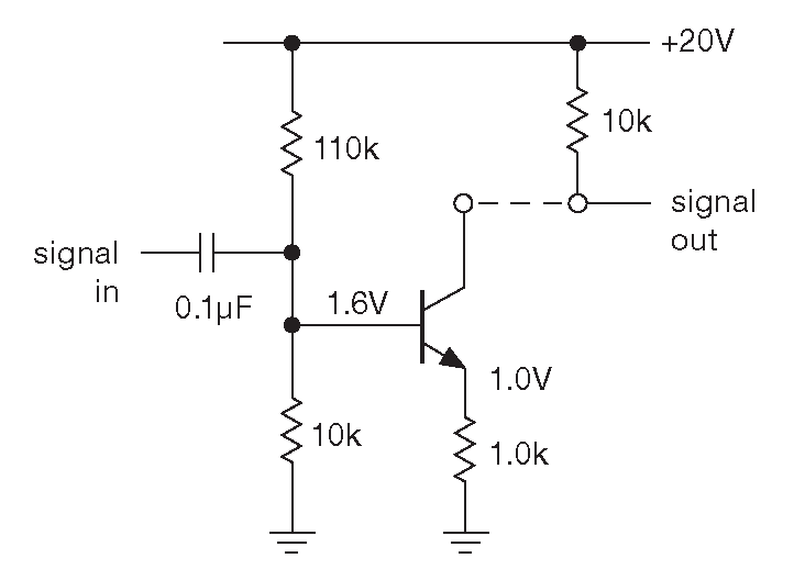 Коллекторный ток покоя составляет 1.0 mA и определяется рабочей точкой базы и эмиттерным резистором 1 kΩ . Указанный ток сдвигает потенциал коллектора на +10 V ( +20 V минус 1 mA через 10 kΩ ). Теперь представим, что в напряжение на базе добавлена сигнальная составляющая \(v_B\) . Напряжение на эмиттере повторяет сигнал \(v_E=v_B\) , что в свою очередь приводит к изменению тока эмиттера \(i_E=v_E/R_E=v_B/R_E\) .