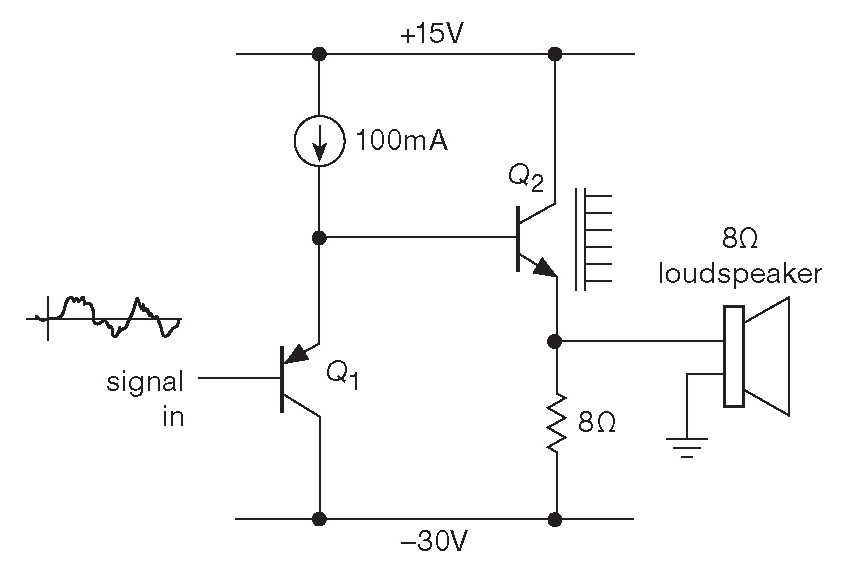 Выходное напряжение схемы достигает почти ±15 V , обеспечивая нужную мощность ( 9 Vrms на 8 Ω ). Но на выходном транзисторе в отсутствие сигнала рассеивается 55W ( на что указывает символ радиатора на схеме ). Ещё 110 W рассеивает эмиттерный резистор. Мощность, расходуемая в состоянии покоя, много выше, чем максимальная выходная. Это отличительная особенность схем «класса-A» ( транзистор всё время в активном режиме ), которые, очевидно, не лучший выбор в задачах, требующих большой выходной мощности.