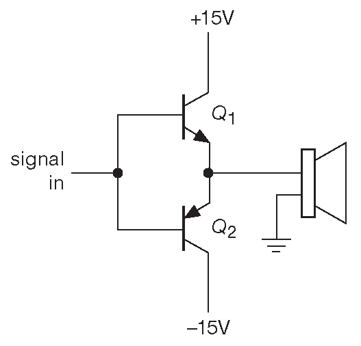 На рис. 2.69 показан симметричный повторитель, выполняющий ту же задачу. \(Q_1\) проводит ток в положительной полуволне сигнала, а \(Q_2\) - в отрицательной. При нулевом напряжении на входе ток через транзисторы не течёт, т.е. мощность не рассеивается. При 10 W выходной мощности каждый из транзисторов рассеивает менее 10 W 51 .