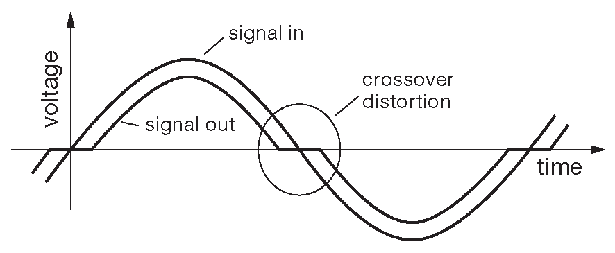 Дополнительным достоинством схемы является некоторый контроль над уровнем остаточных переходных искажений за счёт регулировки тока покоя. Усилители с симметричным выходным повторителем и приличным током покоя, т.е. с двумя транзисторами, находящимися в активном режиме большую часть цикла, называются усилителями «класса-AB». На практике величина тока покоя есть результат выбора между низкими искажениями и высокой рассеиваемой мощностью. Обратная связь, разговор о которой впереди, понизит искажения ещё больше.