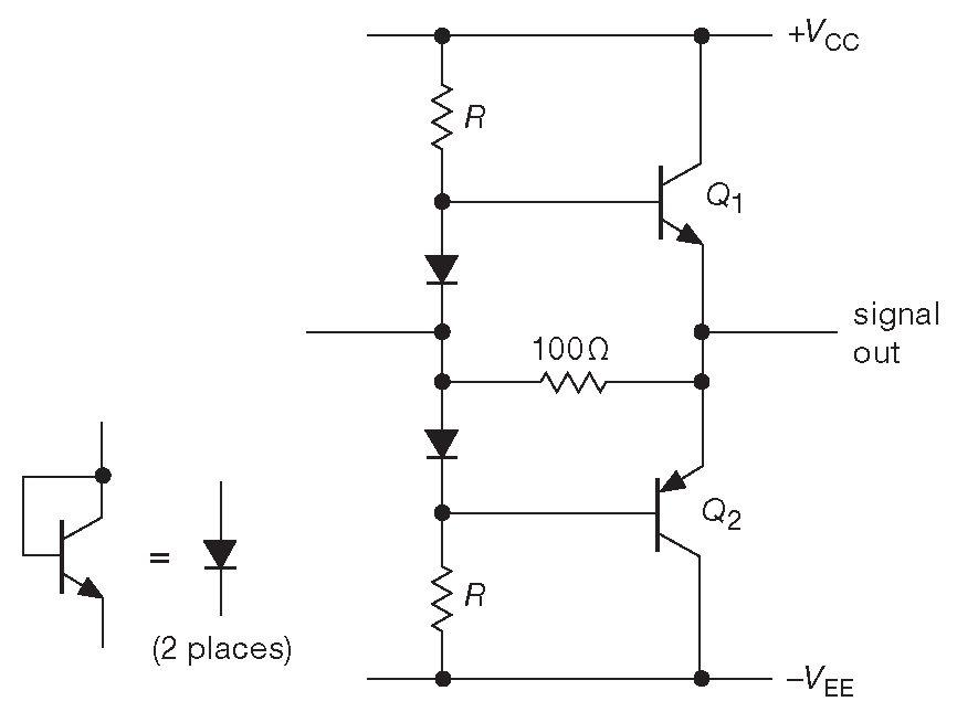 У схемы 2.69 есть недостаток. Она срезает со входного сигнала одно падение \( V_{BE}\) в каждом направлении: по 0.6 V на каждое плечо. Для входного синусоидального сигнала выход выглядит как на рис. 2.70 . В звуковой технике такое изменение называют переходными искажениями . Лучшим лекарством будет перевод обоих транзисторов в частично проводящее состояние, как на рис. 2.71 ( другой метод - использование обратной связи, хотя это тоже не панацея, см. §4.3.1.E ).