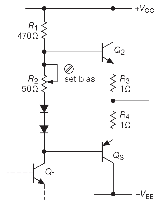 Температурную стабильность можно оценить. Падение база-эмиттер уменьшается на 2.1 mV с каждым градусом роста температуры, а ток коллектора увеличивается в 10 раз на каждые 60 mV увеличения напряжения база-эмиттер ( 4% на 1 mV ). Например, если заменить \(R_2\) диодом, то между базами \(Q_2\) и \(Q_3\) будет три падения на p-n переходе. Т.е. на последовательное соединение \(R_3R_4\) приходится одно падение ( данный факт используется для выбора номиналов \(R_3\) и \(R_4\) , чтобы ток покоя каскада в звуковом усилителе составлял примерно 100 mA ). Самая низкая температурная стабильность будет у конструкции, не обеспечивающей температурного контакта между диодами и выходными транзисторами.