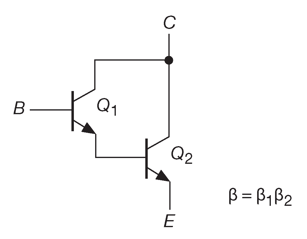 Если соединить два транзистора согласно схеме 2.74 , то результат, его называют схемой Дарлингтона 53 ( или парой Дарлингтона ), ведёт себя подобно одному транзистору с коэффициентом усиления, равным произведению усилений обоих транзисторов 54 . Это очень удобно, когда требуется много тока, например, в регуляторе напряжения или усилительном каскаде, либо, когда нужен очень высокий входной импеданс.