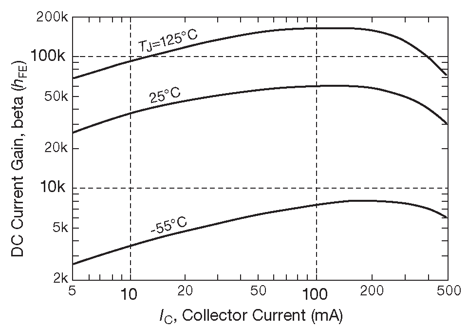 Транзисторы Дарлингтона упаковывают в один корпус и обычно снабжают резистором между базой и эмиттером. Типичные примеры - npn MJH6284 и pnp MJH6287 с усилением по току \(β\)=1000 (тип.) и током коллектора 10 A . Другой популярный комплект - npn TIP142 и pnp TIP147. СтОят по $1 в небольших количествах, \(β\)=4000 , \(I_C\)=5A . Для малосигнального сегмента предназначены MPSA14 ( TO-92 ) или MMBTA14 ( SOT23 ). Минимальное значение беты 10'000 при 10 mA и 20'000 при 100 mA . Это транзисторы с допустимым напряжением 30 V и не имеют резистора база-эмиттер, поэтому их можно использовать на очень низких токах. СтОят $0.10 в небольших количествах. На рис. 2.76 показана их зависимость беты от тока коллектора. Значения приятно высокие, но сильно зависят от тока и от температуры.