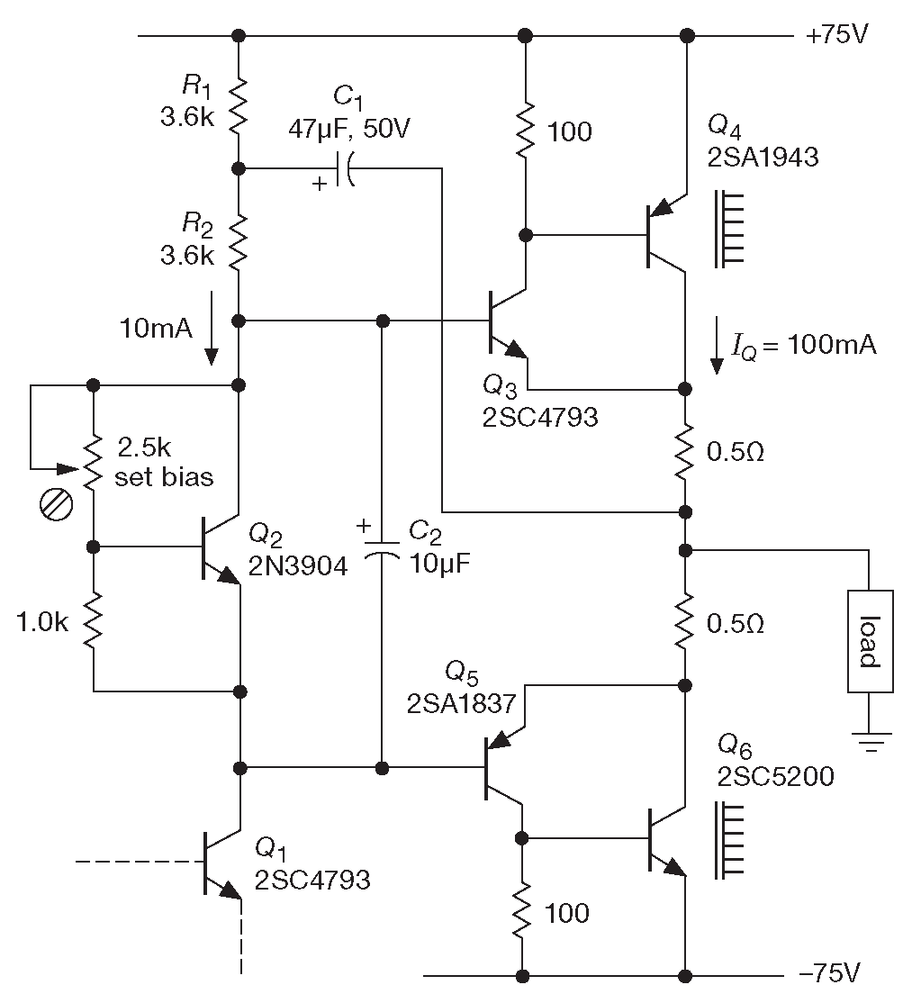 На рис. 2.78 показана очень хорошая схема выходного каскада на парах Шиклай. Она имеет преимущество по сравнению со схемой на парах Дарлингтона. Перевод \(Q_3Q_5\) в «класс-AB» для снижения искажений требует только двух падений на диоде, а не четырёх, и, что важнее, \(Q_3\) и \(Q_5\) греются при работе меньше, чем выходные \(Q_4Q_6\) , поэтому их падение база-эмиттер стабильнее. Такая особенность позволяет задать больший ток покоя, чем для пар Дарлингтона, где нужен большой запас до границы безопасного режима. В итоге такой вариант имеет меньшие искажения 57 .