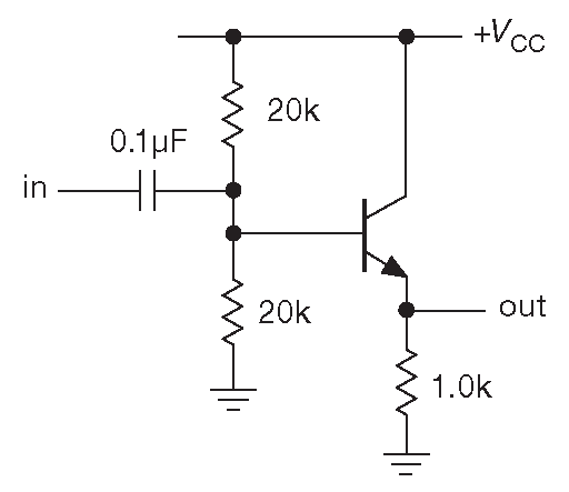 При установлении рабочей точки эмиттерного повторителя делитель выбирается так, чтобы обеспечить жёсткий потенциал на базе, т.е. импеданс делителя должен быть существенно ниже, чем импеданс транзистора со стороны базы . В такой схеме основной вклад во входной импеданс вносит делитель, часто сверх меры нагружая входной сигнал. Пример показан на схеме 2.79 . Входное сопротивление близко к 9.1 kΩ и определяется импедансом делителя 10 kΩ . Но, чем выше входной импеданс, тем лучше. Кроме того, глупо тратить входной сигнал на простой делитель, единственной задачей которого, является задание рабочей точки транзистора.