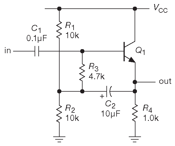Усиление по напряжению для повторителя равно A=\(R_L/( R_L + r_e ) \) , где \(R_L\) - общая нагрузка на эмиттере ( для схемы 2.80 \(R_1∥R_2∥R_4\) [* входной делитель \(R_1R_2\) подключается на частоте сигнала за счёт «обнуления» импеданса \( C_2\)] ), поэтому действующий импеданс \(R_3\) на частоте сигнала составит \(R_3(1 +R_L/r_e ) \) . На практике множитель составляет около 100 , и входной импеданс начинает в основном определяться импедансом транзистора со стороны базы. Усилитель с эмиттерной дегенерацией можно модифицировать аналогично [* т.е. в схеме 2.80 снимаем сигнал с коллектора, а не с эмиттера ] , т.к. сигнал на эмиттере повторяется на базе. Делитель в базе [* его средняя точка ] на частотах сигнала будет подпираться низкоомным выходом с эмиттера, который оградит входной сигнал от воздействия делителя в базе и позволит получить приятно возросший входной импеданс схемы.