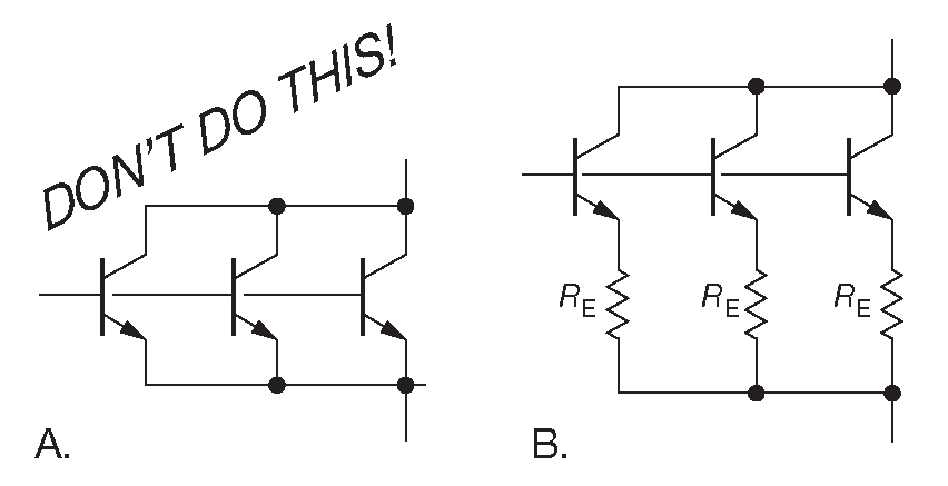 Рис. 2.81 Для выравнивания токов параллельных транзисторов следует использовать балластные резисторы \(R_E\) , как на схеме (B)
