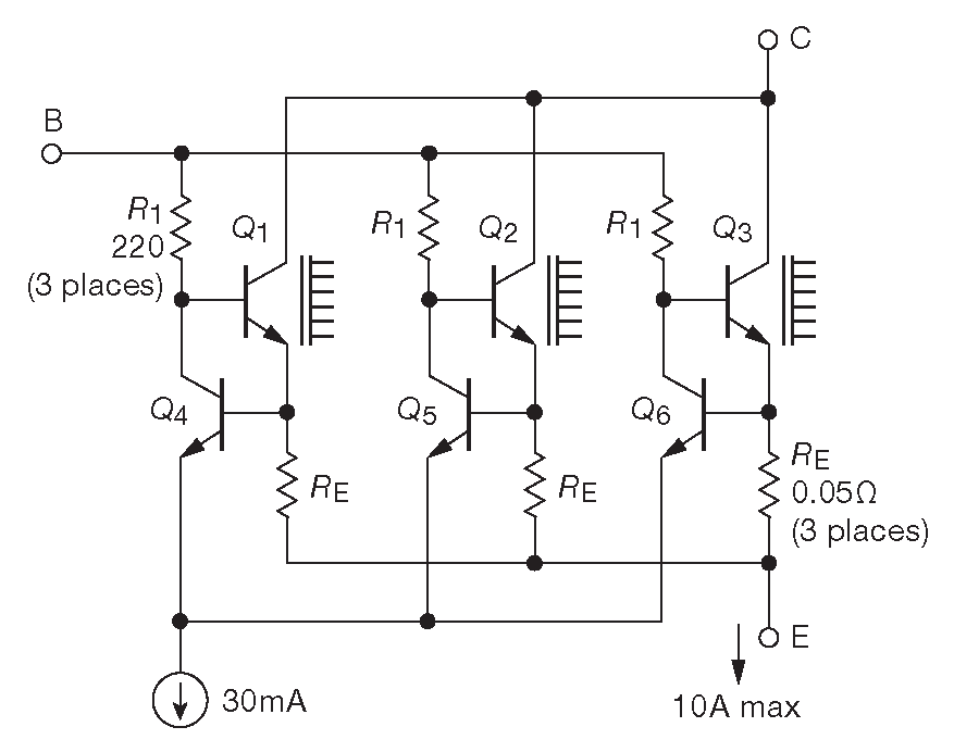 57 Чтобы получить больше тока часто ставят несколько одинаковых транзисторов в параллель с индивидуальными эмиттерными резисторами возле каждого транзистора, см. §2.4.4 . <-