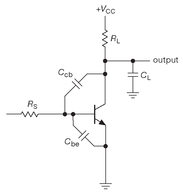 Схема 2.83 показывает бОльшую часть проблем, связанных с ёмкостью перехода. Выходная ёмкость образует с выходным сопротивлением \(R_L\) спад с граничной частотой \( f=1/( 2 π R_LC_L ) \) ( в \(R_L\) входит сопротивление самого коллектора и нагрузки, а \( C_L\) включает ёмкость перехода и опять же нагрузки ).