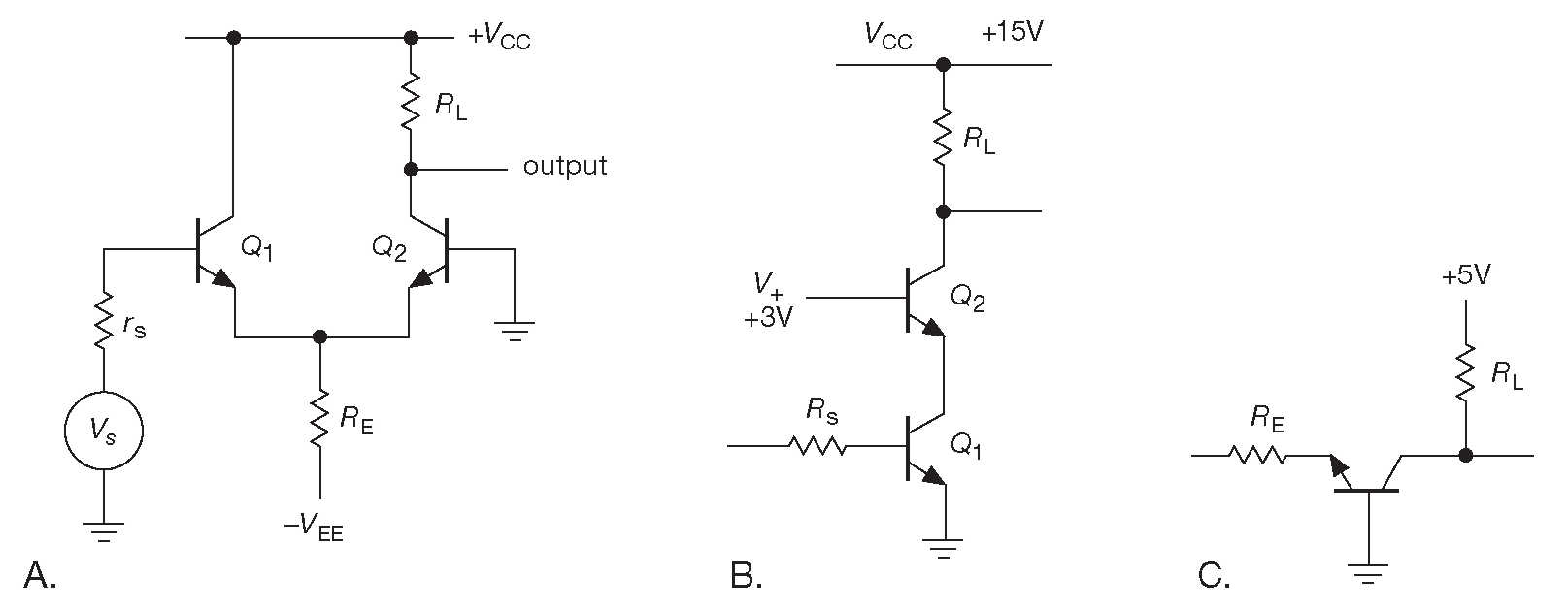 Рис. 2.84 Три схемные конфигурации, подавляющие эффект Миллера. (A) Дифференциальный усилитель, инвертирующий вход которого заземлён. (B) КаскОд. (C) Усилитель с общей базой