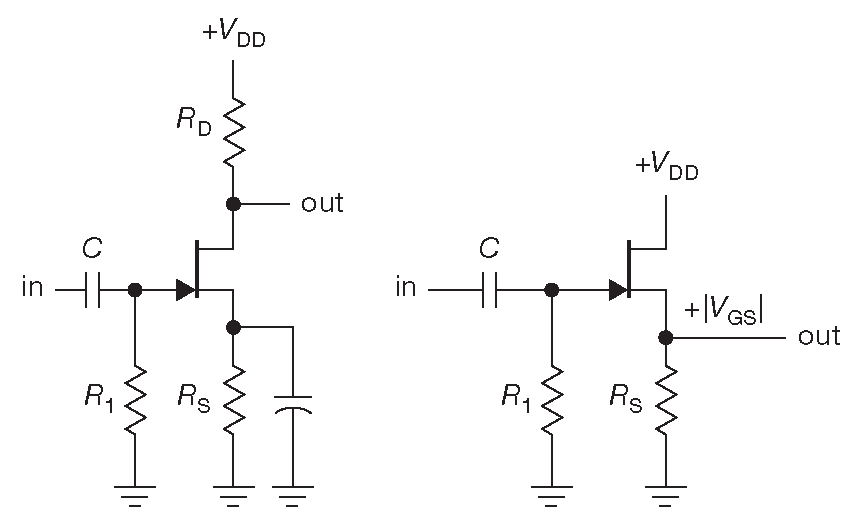 Рис. 3.28 Усилитель с общим истоком и истоковый повторитель. В обеих конфигурациях потенциал истока выше земли, потому что ток истока проходит через резистор \(R_S\) . Точка покоя \(V_S=\)[\(V_{out}=\)]\(V_{GS}=R_SI_D\), где \(I_D\) - ток стока при заданном \(V_{GS}\)
