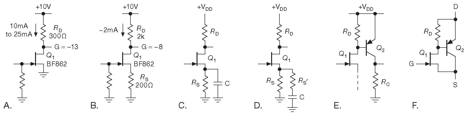Чтобы познакомить читателя с реальными компонентами и номиналами, был выбран образцово-показательный BF862. Это ПТ с высокой крутизной ( 45 mS тип. при \(I_{DSS}\) ) и узким диапазоном \(I_{DSS}\) ( 10...25 mA ). Кроме того, как станет ясно из Части _8 , это ещё и малошумящий прибор. \(R_D\) подбирается так, чтобы при \(I_{DSS}\)(max) на \(Q_1\) приходилось не менее 2.5 V . Типичное усиление составит G=–\(g_m/R_D\)≈–13 ( инвертирующий каскад ).