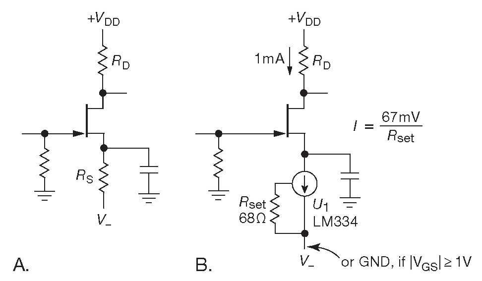Схемы на рис. 3.29 работают от одного положительного источника питания. Они просты, но из-за слишком расплывчатых паспортных параметров \(I_{DSS}\) и \(V_{GS}\) задание рабочего тока в них затруднено. С дополнительным отрицательным источником появляется несколько способов задания точного рабочего тока. На схеме 3.30A такой ток задаётся резистором \(R_S\) , подтягивающим исток к отрицательной шине. \(I_D=-(V_- +V_{GS})/R_S\) или примерно \(V_-/R_S\) для больших по сравнению с \(V_{GS}\) отрицательных потенциалов. Шунтирующий конденсатор ( как на рис. 3.29C ) позволяет получить с ПТ всё возможное усиление на частотах сигнала, т.е. \(G_V=-g_mR_D\) , где \(g_m\) - крутизна при рабочем токе. Более сложная схема 3.30B использует подтяжку на управляемом источнике тока. LM334 - недорогой ( $0.50 ) подстраиваемый единственным резистором источник тока ( см. §9.3.14.B ). Здесь он выставлен на 1 mA ( \(I\)≈67.7 mV/\(R_{SET}\) ). Указанные методы нивелируют неопределённость цифр рабочего тока, т.к. не зависят от величины \(V_{GS}\) . Кроме того, LM334 работает при полном падении вплоть до 1V , что позволяет работать от единственного источника, если минимальное паспортное напряжение затвор-исток при требуемом токе превышает эту величину 35 .