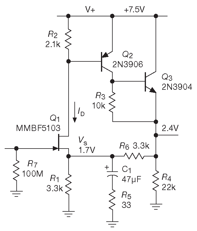 Вот как она работает. Затвор находится на уровне земли. Предположим, что напряжение на истоке при этом равно 1.7 V , выберем \(R_1\) под ток 500 μA . Из них 300 μA поступает через канал \(Q_1\) ( \(V_{BE}\) транзистора \(Q_2\) , приложенное к резистору \(R_2\) ), значит, ∼200 μA идёт через \(R_6\) . Следовательно, на выходе +2.4 V , а ток эмиттера \(Q_3\) составляет около 250 μA ( 110 μA через \(R_4\) и 200 μA через \(R_6\) минус 60 μA через \(R_3\) ).