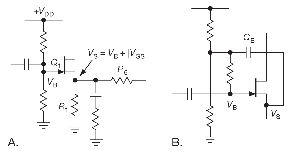 Ещё один метод борьбы с неопределённостью \(V_{out}\) - подача положительного смещения на затвор ( рис. 3.33A ). Такая схема добавляет положительное смещение \(V_B\) в исток, увеличивая потенциал на нём до \(V_S=V_B-V_{GS}\) , причём для n-канальных ПТ \(V_{GS}\) - величина отрицательная. Такой приём уменьшает долю [* неопределённого ] \(V_{GS}\) в уровне \(V_S\) и вместе с ней увеличивает точность определения \(V_S\) . Наконец, коли делитель, устанавливающий рабочую точку, уже появился в схеме, нечего не мешает присовокупить и вольтодобавку ( рис. 3.33B ), чтобы поднять входной импеданс 39 .