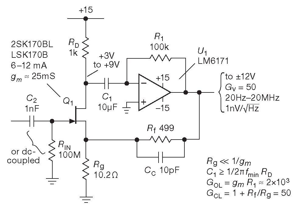 Как и в предыдущей схеме, LM6171 даёт полный размах ±10 V на полосе 10 MHz . 50 Ω последовательно с выходом обеспечивает устойчивость при емкостной нагрузке и обеспечивает «обратное» согласование для 50-омного коаксиального кабеля ( см. Приложение _H [* и §12.10.2 ] ). ОУ не особо тихий ( \(e_n\)≈12 nV/\(\sqrt{Hz}\) ), но здесь это допустимо: усиление входного каскада G ≈ 40 снижает вклад от шума ОУ, приведённого ко входу, до ∼0.3 nV/\(\sqrt{Hz}\) . Общий шум схемы ∼2 nV/\(\sqrt{Hz}\) 46 .