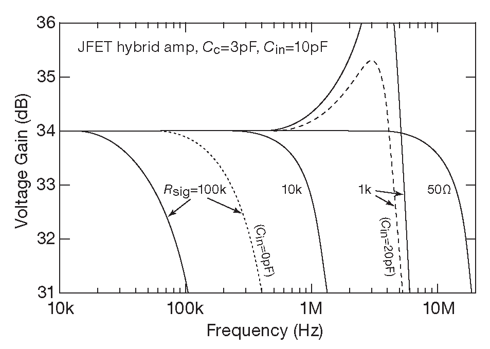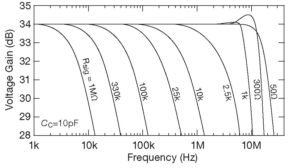 37 А сопротивление источника \(R_{SIG}\) порядка нескольких килоом немного расширяет полосу, но добавляет неравномерность на верхней границе . <-
