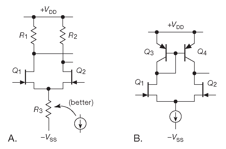 На рис. 3.36 показаны простые конструкции, аналогичные дифференциальным усилителям на биполярных транзисторах ( рис. 2.63 и 2.67 ). Коэффициент передачи по дифференциальному сигналу для варианта 3.36A ( \(ΔV_{out}/ΔV_{in}\) для \(R_1=R_2\) и дифференциального выхода ) равен G=\(g_mR_1\) . Подавление синфазной составляющей сильно увеличивается, если \(R_3\) заменить источником тока. Недостатком схемы является неопределённость усиления ( следствие разброса крутизны ) и его общая скромная величина ( у ПТ вообще с крутизной проблемы ). Ограничения по усилению можно обойти токовым зеркалом в качестве стоковой нагрузки ( рис. 3.36B ), но рабочая точка такой схемы нестабильна и требует второго каскада, обеспечивающего обратную связь по постоянному току.