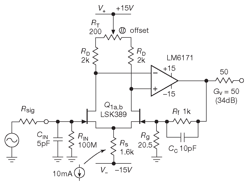 Проблема решается согласованной парой полевых транзисторов в дифференциальном включении со связью по постоянному току ( рис. 3.37 ). В этом дифференциальном усилителе с общим истоком входной сигнал приходит только на одну сторону. Выходное дифференциальное напряжение подаётся на широкополосный ОУ, выход которого приходит на другой вход дифференциальной пары, замыкая обратную связь. Как и в предыдущей схеме, общее усиление \(G_{CL}=1+R_f/R_g\)=50 , а небольшой \(C_C\) выравнивает АЧХ на верхней границе.