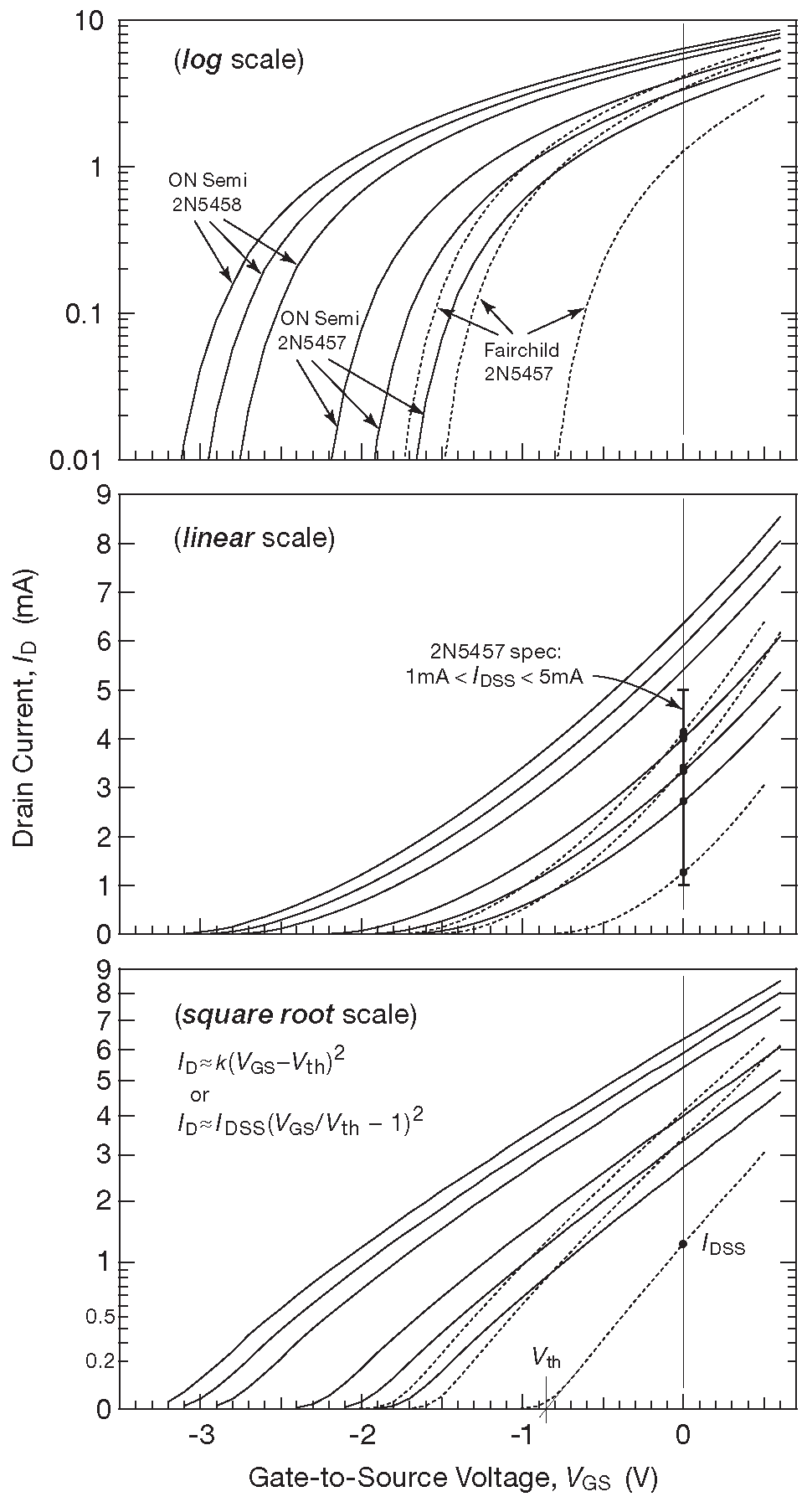 Рис. 3.51 Зависимость тока стока от напряжения на затворе для девяти образцов из набора n-канальных 2N5457/58/59 при \(V_{DS}\)=5V . Одни и те же данные представлены в трёх формах: линейной, логарифмической и в виде квадратного корня. Компоненты ON Semi и Fairchild соответствуют спецификации по \(I_{DSS}\) ( средний рисунок ), хотя имеют заметно отличающиеся графики. Обратите внимание, что графики уходят за \(I_{DSS}\) до \(V_{GS}\)=+0.6V