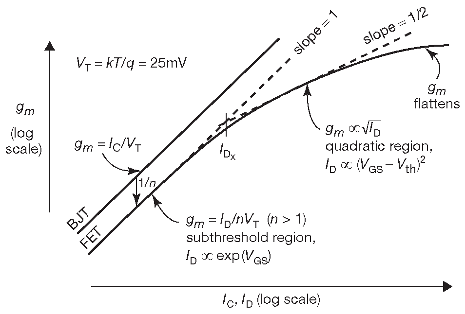 Рис. 3.53 Крутизна, как функция тока стока. В подпороговой области крутизна ПТ пропорциональна току стока ( как в биполярных приборах ). При нормальных токах, где \(I_D∝(V_{GS}-V_{th})^2\) , крутизна пропорциональна уже \(\sqrt{I_D}\) . Если же ток ещё выше [* при токовом насыщении ] , то крутизна плавно переходит к почти постоянному максимальному значению