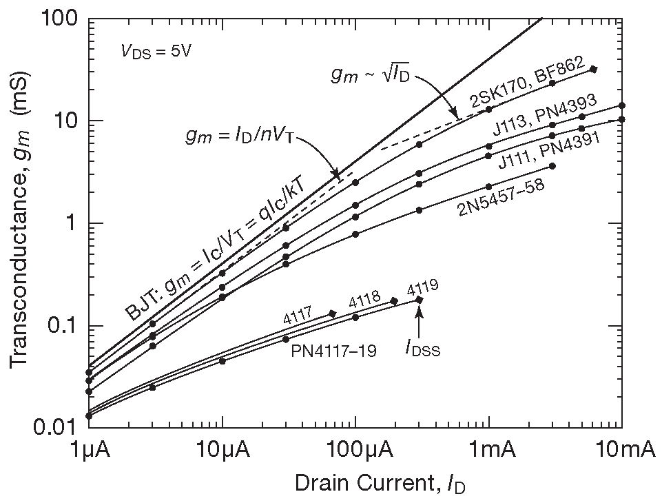 58 Вот только полоса пожиже! К примеру, при токе \(I_D\)=10 pA произведение усиление-полоса \(f_T\) в 2N5457 составит жалкие 140Hz ( \(f_T=g_m/(2πC_{ISS})\) , см. «Полоса каскода, биполярные транзисторы в сравнении с полевыми» в Части X3 ). Приятно узнать, что полевые транзисторы, подобно биполярным хорошо работают при очень малых токах, что очень ценное свойство для малопотребляющих схем. Но не стоит забывать, что емкости переходов при низких токах угрожающе растут, поэтому при малых токах схемы работают медленнее, чем при больших. <-