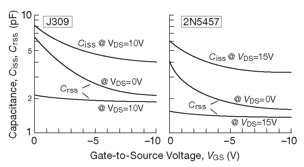 Подобно биполярным транзисторам ( и МОП, куда без них ) в ПТ есть ёмкость между выводами, которая зависит от обратного смещения. Она зовётся «нелинейной ёмкостью» и сильно снижается с увеличением обратного смещения. На рис. 3.57 показаны найденные в справочных данных графики ёмкости обратной связи и входной ёмкости двух распространённых n-канальных моделей. Приведённые величины - всего несколько пикофарад - типичны для малосигнальных ПТ и несколько меньше, чем можно найти в мощных МОП транзисторах ( сравните с рис. 3.100 на стр. 197 ). ПТ с p-n переходом обычно симметричны, но за счёт большего обратного смещения ёмкость сток-затвор меньше, чем затвор-исток 64 . Но это хорошо, т.к. эффект Миллера умножает \(C_{RSS}\) в усилителе с общим истоком без каскода.