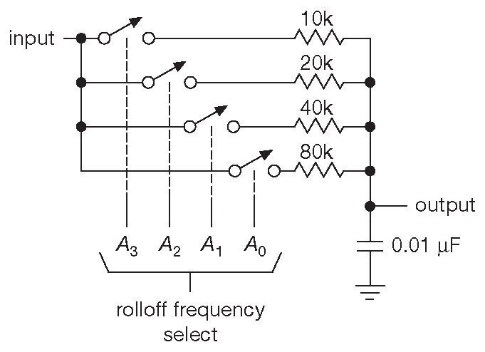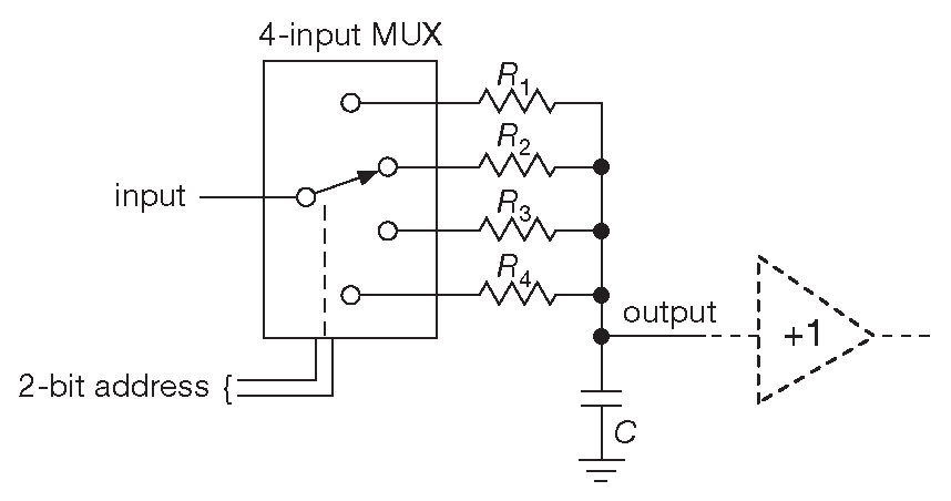 На рис. 3.82 показан простой RC ФНЧ с изменяемой частотой среза. Мультиплексор выбирает один из четырёх задающих частоту резисторов, для чего нужен 2-разрядный адрес. Мультиплексор стоит прямо на входе перед резисторами, чтобы уменьшить инжекцию заряда за счёт подключения к точке с низким импедансом [* инжекцию так уменьшить нельзя, можно лишь снизить амплитуду выброса в линии ] . Другой вариант - выбирать конденсатор . Если требуются очень большие постоянные времени, то можно действовать и так, но на высоких частотах ограничителем станет отношение \(R_{ON}/R_{series}\) . На схеме отмечен буфер с единичным усилением, т.к. выходной импеданс схемы получается достаточно большим. В Части _4 будет показано, как делать «идеальные» повторители ( с высокой точностью усиления, высоким \(Z_{in}\) , низким \(Z_{out}\) , отсутствием смещения \(V_{BE}\) и т.п. особенностями ). Конечно, если каскад после фильтра уже имеет большое входное сопротивление, дополнительный буфер не требуется.